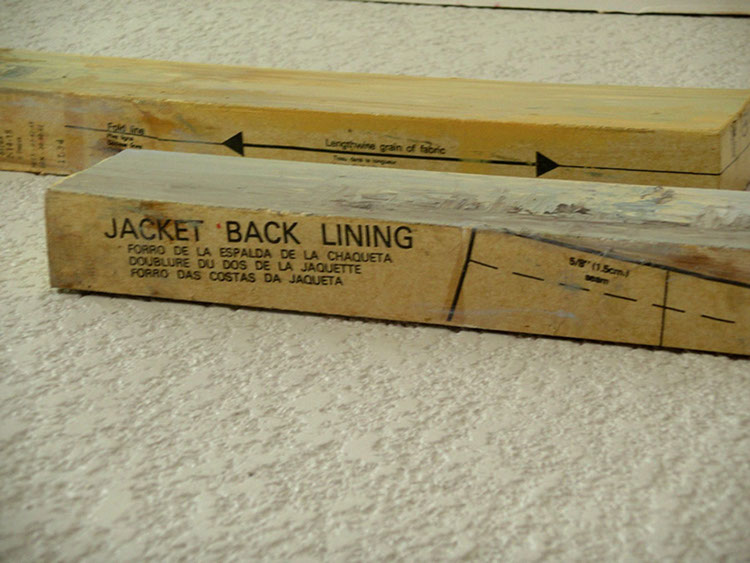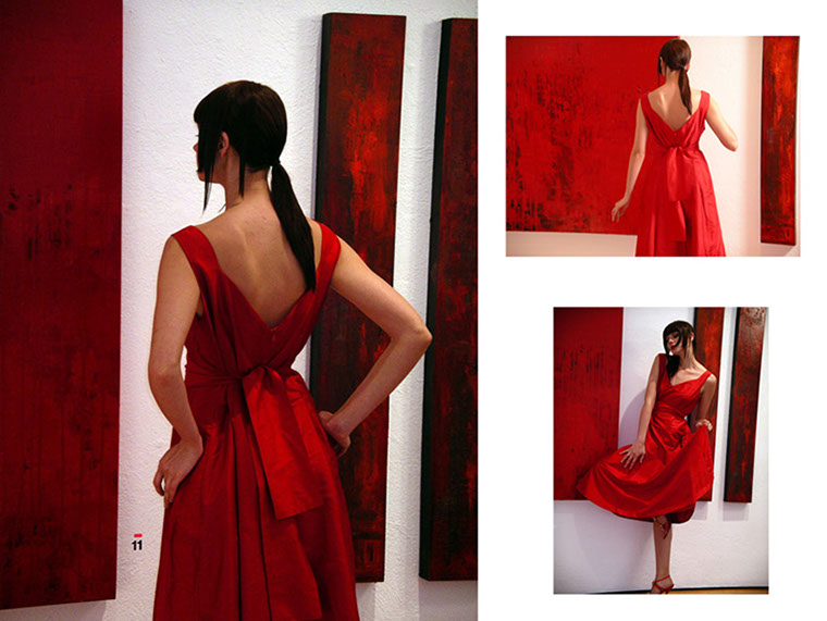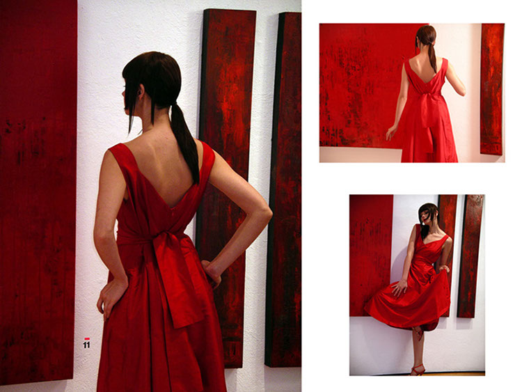 Se observa en las piezas la utilización de patrones para la fabricación de prendas. Al mismo tiempo se hace alusión a las tallas, tendencias y códigos. La artista traduce en términos meramente pictóricos los paradigmas de la moda, sobre glamour, lujo y elegancia. El rojo también es la tonalidad de la excitación y el apasionamiento. La parte no lúdica del asunto también es objeto de reflexión: las tallas exigidas hoy en día son demasiado pequeñas o ajustadas, ña industrialización es voraz y la confección de muchas prendas, en las maquiladoras del Tercer Mundo (especialmente en Asia), no es precisamente algo para enorgullecerse.