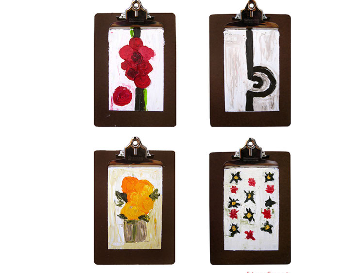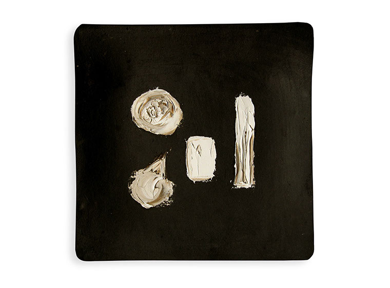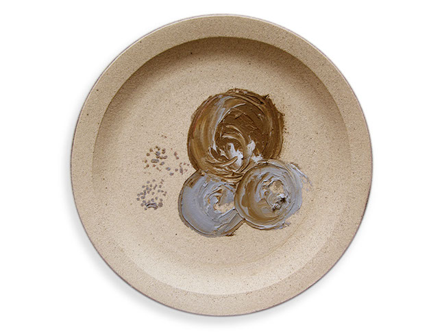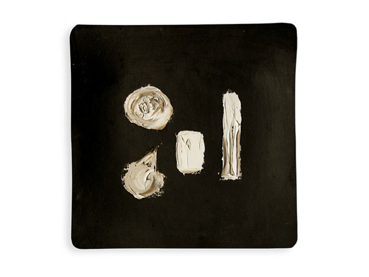Siguiendo su interés en trabajar sobre los soportes no tradicionales - en su exposición anterior presentó pinturas sobre lámparas, tapices y cajas de puros- Edurne diseño una serie de platos realizados en Oaxaca por el ceramista Claudio Jerónimo López y los intervino con trazos geométricos plasmados al óleo.
